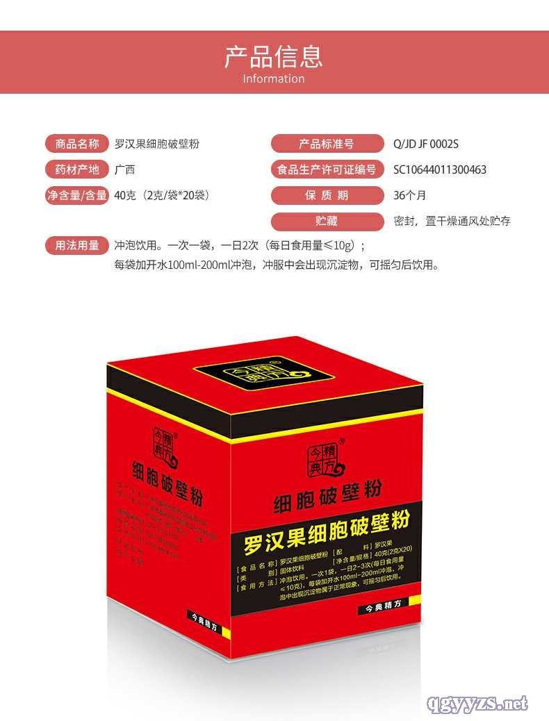 | 用法用量 | 沖泡飲用,一次1袋,一日2次。 羅漢果細(xì)胞破壁粉沖服中出現(xiàn)的少量沉淀物屬于正,F(xiàn)象,可搖勻后飲用 |