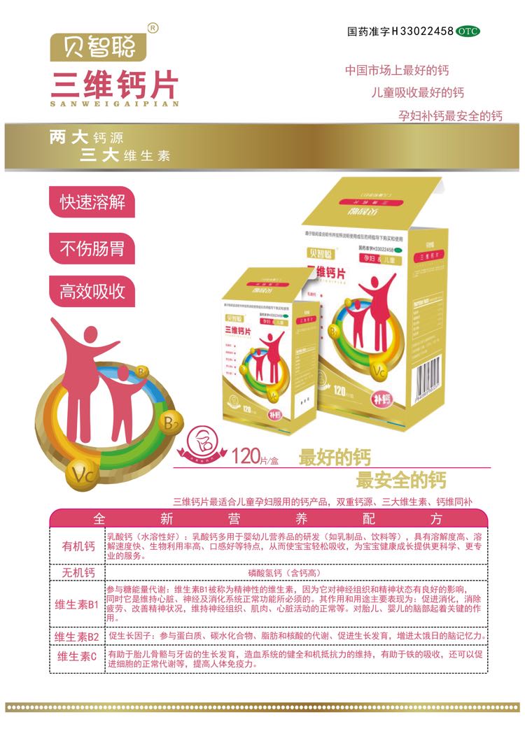 | 產(chǎn)品賣點 | 《貝智聰三維鈣片》三大優(yōu)勢: 一、產(chǎn)品優(yōu)勢 ◆富含乳酸鈣、磷酸氫鈣兩大鈣源以及三大維生素(VB1.VB2.VC);鈣維同補,全新配方,黃金搭配(維生素本身可以和鈣質(zhì)產(chǎn)品協(xié)同作用,相對于單純補鈣來說,服用后益處更大更容易吸收) ◆精選優(yōu)質(zhì)乳酸鈣鈣源,杜絕碳酸鈣吸收率低,結(jié)石易上火的特點,國藥準(zhǔn)字(預(yù)防+治療),**可靠 ◆濃縮型小鈣片,咀嚼片,水果味,口感好 |