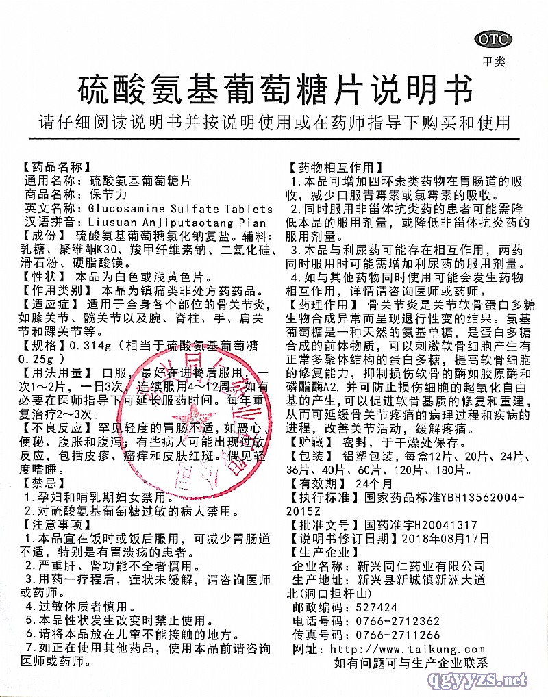 | 產(chǎn)品規(guī)格 | 0.314g(相當(dāng)于硫酸氨基葡萄糖0.25g)*60片 |