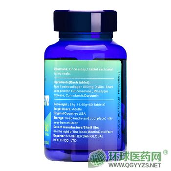 | 主要成分 | 膠原蛋白(Ⅱ)、木糖醇、鯊魚(yú)骨粉、蝦蟹濃縮粉、菠蘿蛋白酶、玉米淀粉、裸藻、姜黃 |