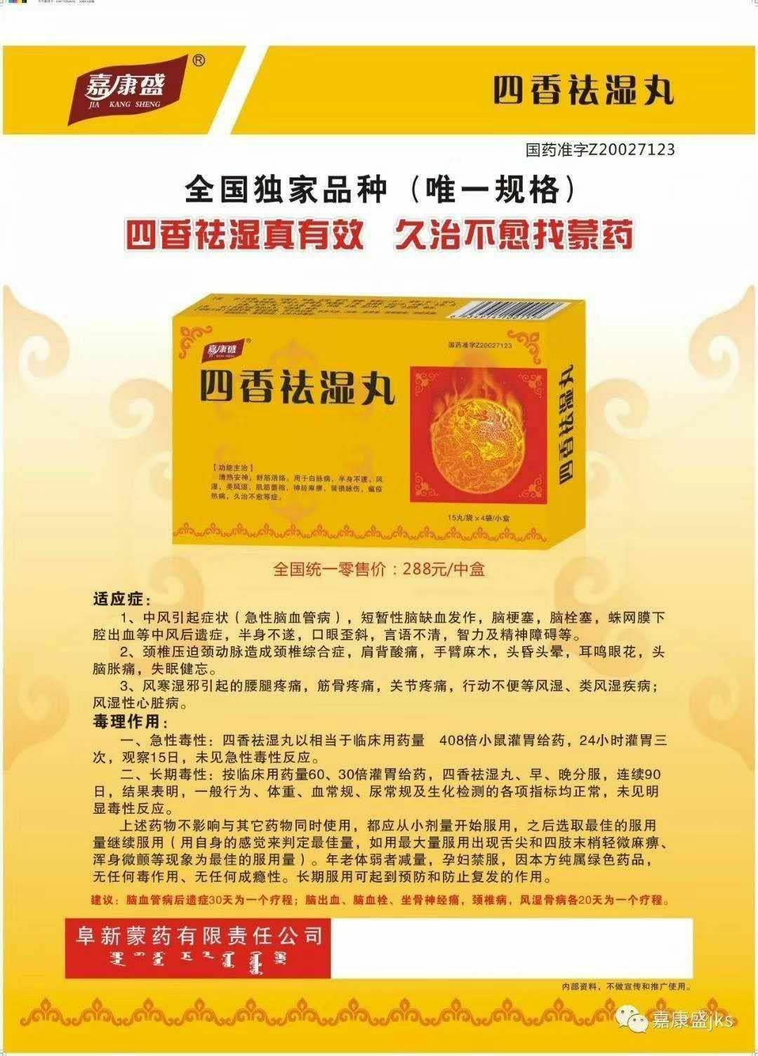 | 補(bǔ)充說(shuō)明 | 1.獨(dú)廠獨(dú)規(guī):四香袪濕丸 修復(fù)神經(jīng) 袪除濕邪 29味野生藥材入藥,**能根治風(fēng)濕骨病 。 2.品種走控銷 全國(guó)統(tǒng)一零售288元。 3.主要針對(duì)診所和院外臨床。公司提供全程學(xué)校支持,產(chǎn)品培訓(xùn),員工培訓(xùn),公司運(yùn)營(yíng)全方位指導(dǎo)。 4.聯(lián)合吡羅昔康腸溶片 **當(dāng)次口服見(jiàn)效,解決病患痛苦,******退貨! 攜手雄陀針刀療法免費(fèi)義診巡診,品種好推廣,代理商易結(jié)款。 5.三盒一療程 連續(xù)服用3療程 **兩年以上不在復(fù)發(fā)! |