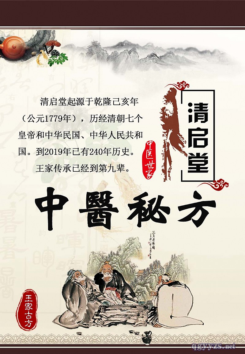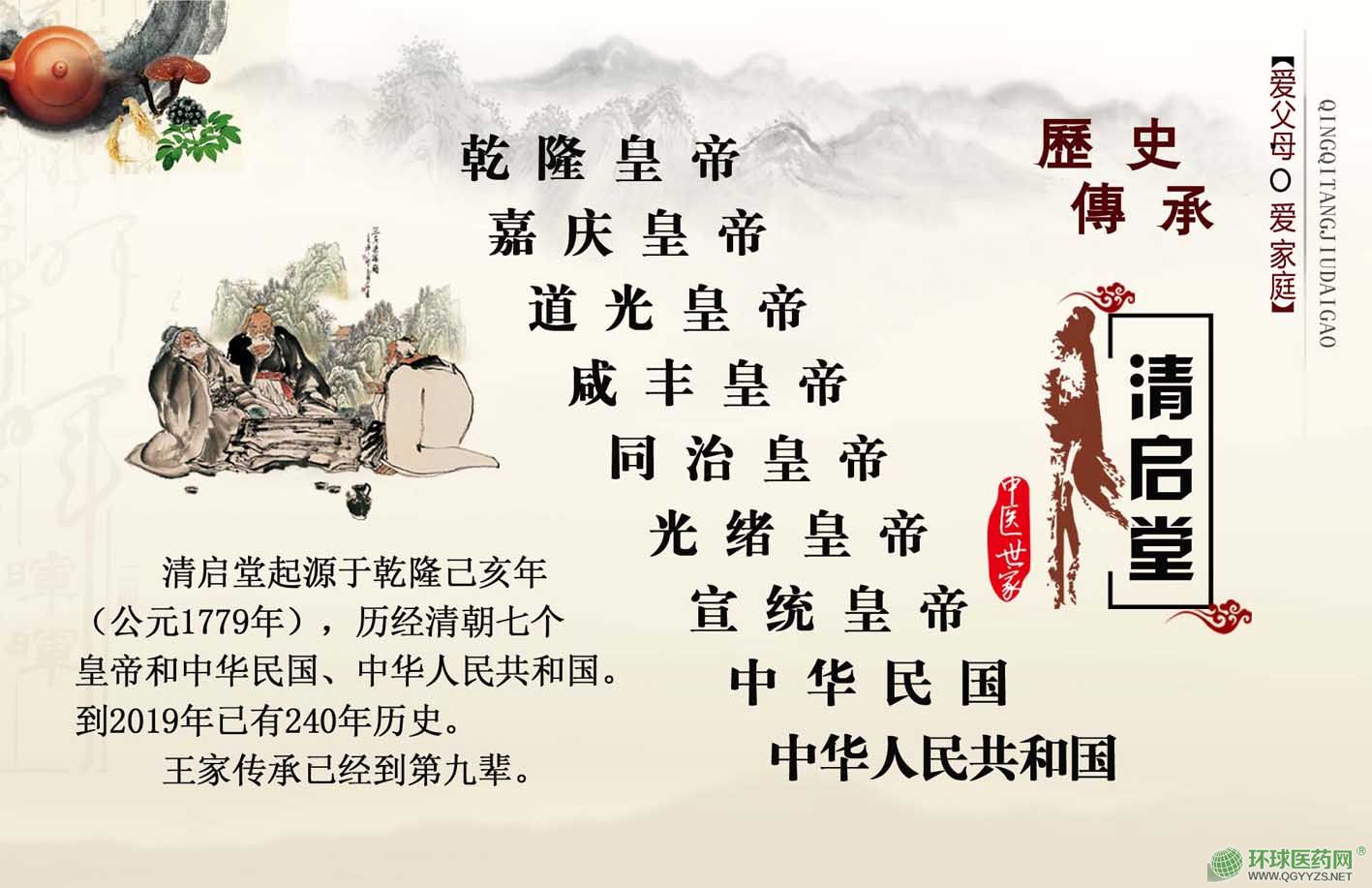 | 其它說明 | 清啟堂創(chuàng)始于乾隆己亥年(公元1779年)。清啟堂創(chuàng)始人王玉璽,生于乾隆1761年4月,排行老四,一生樂善好施,情操高潔。3歲隨父親識(shí)字,5歲跟父親上山采藥、識(shí)藥。8歲在機(jī)緣巧合下拜李太醫(yī)為師,潛心學(xué)習(xí)中醫(yī)十年。望、聞、問、切、樣樣精通,對(duì)婦科、外科、骨科等病癥,達(dá)到了妙手回春,手到病除 。18歲和師傅李太醫(yī)在兵營(yíng)精心研制出《風(fēng)損膏》《筋骨膏》《跌打散》《拔毒膏》《接骨膏》等30多種神效的外用藥。 |