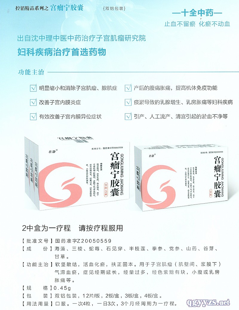 | 補(bǔ)充說(shuō)明 | 軟堅(jiān)散結(jié),活血化瘀,扶正固本。用于子宮肌瘤(肌壁間,漿膜下)氣滯血瘀,癥見(jiàn)經(jīng)期延長(zhǎng),經(jīng)量過(guò)多,經(jīng)色紫黯有塊,小腹或乳房脹痛等 |