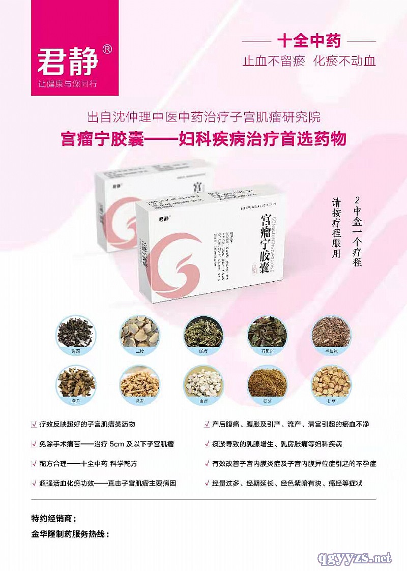 | 功能主治 | 軟堅(jiān)散結(jié),活血化瘀,扶正固本。用于子宮肌瘤(肌壁間,漿膜下)氣滯血瘀,癥見(jiàn)經(jīng)期延長(zhǎng),經(jīng)量過(guò)多,經(jīng)色紫黯有塊,小腹或乳房脹痛等 微電同好18839795898 |
