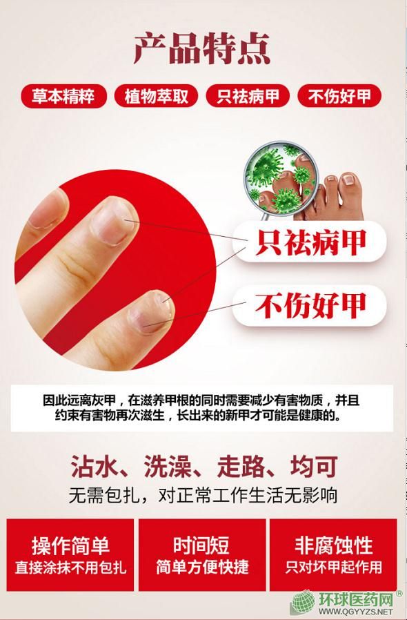 | 產(chǎn)品用途 | 灰指甲真菌都是寄生在甲板里和甲床上,只有將甲板清理干凈才能**清理灰指甲真菌! 甲康寧修復(fù)原理: 1.甲康寧冷敷凝膠中抗菌成分在中間形成保護(hù)膜。避免真菌的再次感染,狙擊真菌 2.滋養(yǎng)成分滲入甲床,建立健康基地,長出新甲。 專業(yè)醫(yī)療器械,**有** |
