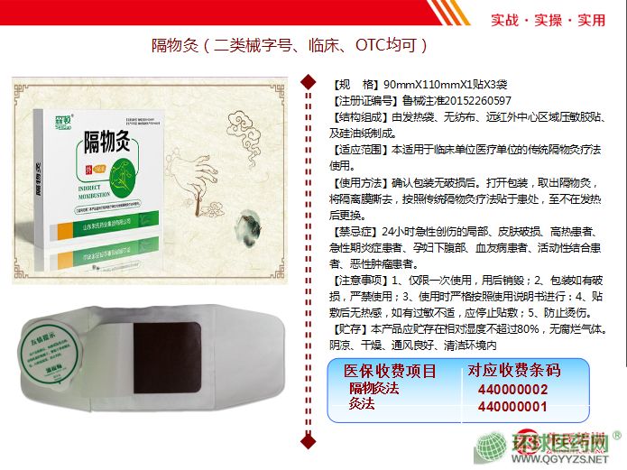 | 產(chǎn)品用途 | 本品適用于臨床醫(yī)療單位的傳統(tǒng)隔物灸療法中使用。(該產(chǎn)品適用于頸椎病、肩周炎、骨質(zhì)增生、腰椎間盤突出、腰腿疼、跌打損傷、風(fēng)濕關(guān)節(jié)炎等引起的疼痛,和女性暖宮作用)。 |