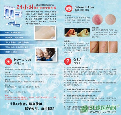 | 產(chǎn)品賣點 | (1)****醫(yī)用高分子材料,無激素、礦物油等其他成分 (2)對手術(shù)、燒傷、燙傷、擦傷或裂傷造成的疤痕和增生性疤痕有**療效 (3)適用人群:全年齡向,敏感肌膚也可使用 (4)可與護(hù)膚品、化妝品同時使用 |