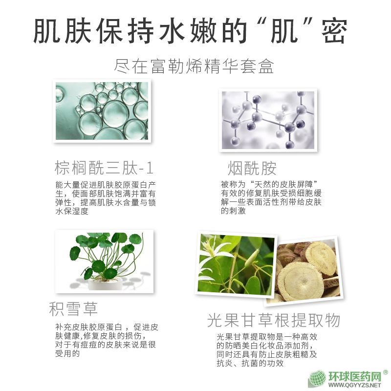 | 產(chǎn)品用途 | 蘊(yùn)含抗氧化抗衰老的富勒烯單質(zhì)碳C60,輔以積雪草、虎杖根、黃芩根、茶葉、光果甘草、母菊花、迷迭香等美白抗皺植物提取能夠親和自由基,增強(qiáng)肌膚抗氧化能力,活化肌膚鎖水抗衰。蘊(yùn)含豐富棕櫚酰三肽精華,每一滴精華都密集補(bǔ)水修護(hù),深度補(bǔ)水鎖水。棕櫚酰三肽能夠大量促進(jìn)皮膚膠原蛋白再生,使面部肌膚飽滿有彈性,補(bǔ)水鎖水,使皮膚觸感柔滑細(xì)嫩,由內(nèi)而外提亮晦暗肌膚 |