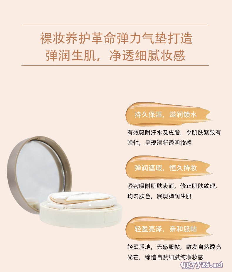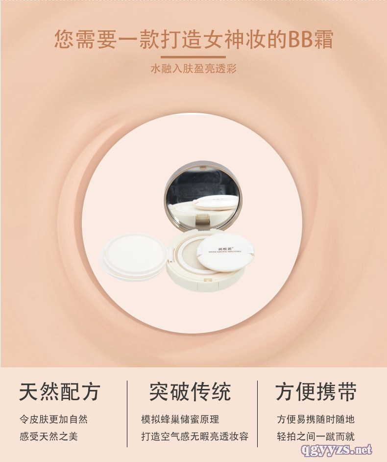 | 補(bǔ)充說(shuō)明 | 支持OEM加工定制,簡(jiǎn)單輕松打造自然干凈皮膚,模擬蜂窩原理研制而成,將BB霜緊鎖于具有萬(wàn)千細(xì)孔的海綿氣墊粉芯內(nèi),質(zhì)地潤(rùn)澤柔滑。完美遮瑕不脫妝,能夠遮蓋細(xì)紋,斑點(diǎn),痘印,疤痕等。粉質(zhì)細(xì)膩易上妝,輕松打造水潤(rùn)光透立體妝容。針對(duì)不同膚色需求 |