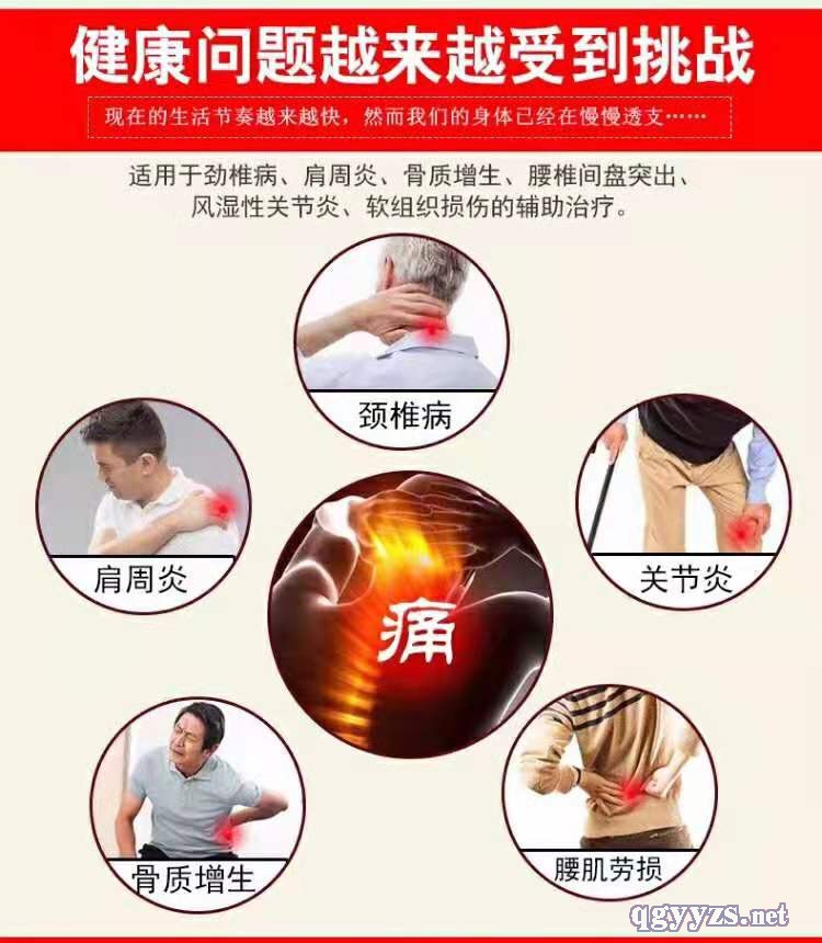 | 產品用途 | 主要用于QL-I型頸椎病、肩周炎、骨質增生、腰椎間盤突出、風濕性關節(jié)炎、跌打損傷的輔助治療。 |