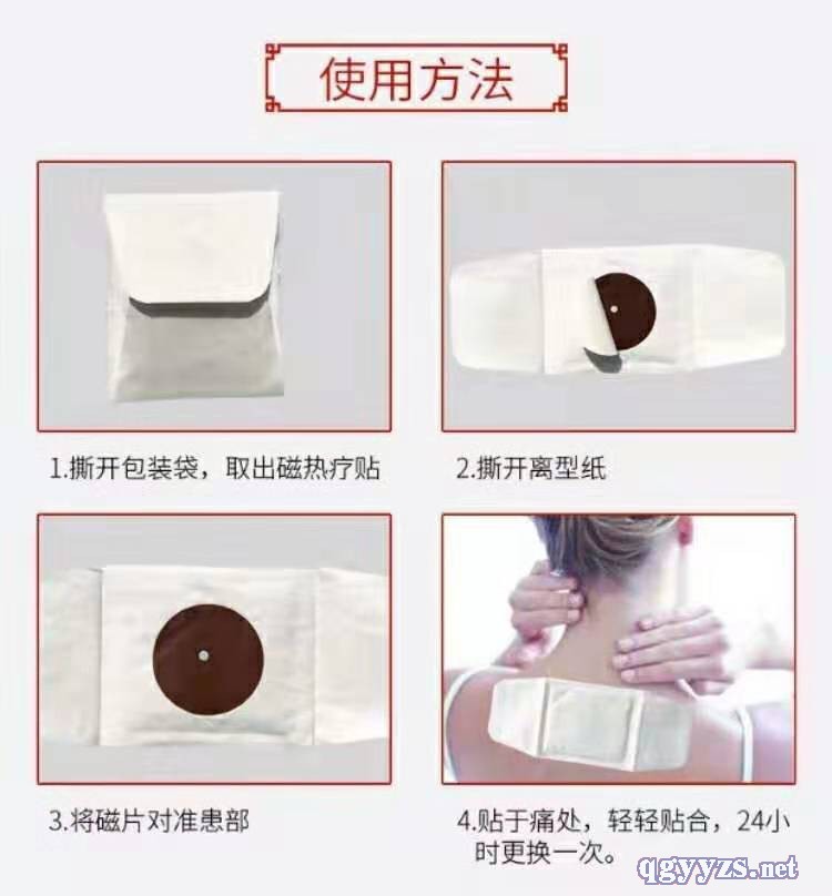 | 使用方法 | 清潔患處,確認(rèn)包裝無(wú)破損后,打開(kāi)包裝,取出磁熱療貼,將貼劑的隔離膜撕去,貼于患處,每24小時(shí)更換一次。 |