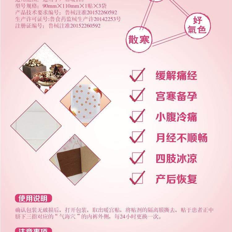 | 其它說明 | 暖宮貼的功能是通過對局部及相關(guān)穴位的熱熨、刺激、推動脘腹代謝機能 ,加快氣血循環(huán)、散寒、散瘀、活血從而達到溫經(jīng)通絡(luò)、驅(qū)風除寒、活血 化瘀、內(nèi)病外治的功效。 |