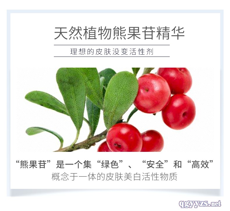 | 作用機(jī)理 | 核心美白成份熊果苷,萃取自熊果的葉子,能有效阻止黑色素生成,減少皮膚色素沉積,**又達(dá)到即時(shí)美白的效果。熊果苷是源于綠色植物的天然活性物質(zhì) |
