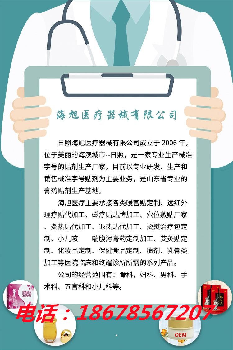 | 補(bǔ)充說(shuō)明 | 山東日照海旭器械有限公司艾炙帖 醫(yī)保收費(fèi)膏藥產(chǎn)品精油艾灸貼,是走臨床骨傷科、中醫(yī)科、康復(fù)理療科、針灸推拿科、風(fēng)濕科等科室的醫(yī)保膏藥產(chǎn)品,文號(hào)獨(dú)立正規(guī),該產(chǎn)品在全國(guó)多地高價(jià)中標(biāo)掛網(wǎng)! |