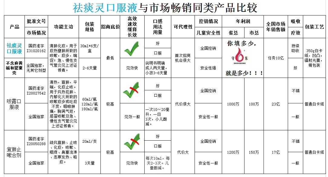 | 補充說明 | 1、全國**醫(yī)保 2、純中藥,不好麻黃堿,不含***,不含乙醇,無藥物依賴性,標本兼治 3、口感清甜,服用方便,兒童愛喝(一盒3-6天用量) 4、清肺、化痰、止咳、平喘、消炎、氣管炎六效合一 5、地道藥材,經(jīng)典配方(鮮竹瀝含藥量達到70,而其他同類產(chǎn)品含藥量在42,而且祛痰靈的規(guī)格是180毫升,而其他規(guī)格多為60毫升) 6、含有天然又**的抗生素魚腥草,完美結(jié)合,療效** 7、無其他劑型,市場競爭小 8、上海產(chǎn)地、**產(chǎn)品 【財富熱線】18916311867 |