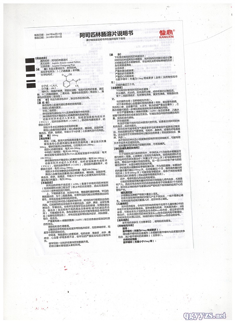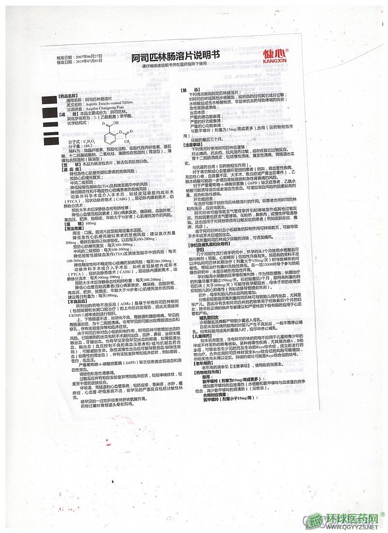 | 用法用量 | 用法:口服。腸溶片應(yīng)飯前用適量水送服。 降低急性心肌梗死疑似患者的發(fā)病風(fēng)險:建議首次劑量300mg,嚼碎后服用以快速吸收。以后每天100-200mg。 預(yù)防心肌梗死復(fù)發(fā):每天100-300mg。 中風(fēng)的二級預(yù)防:每天100-300mg。 |