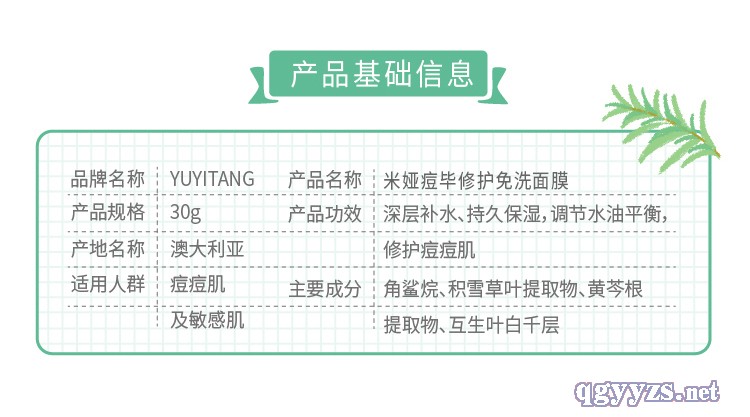| 補充說明 | 清爽保濕,免洗面膜為你省去很多瑣碎煩惱,涂抹在臉上,橫掃一整天的疲憊,不油不膩,排解痘肌燥熱,讓痘痘得到瀅潤呵護,隔天會發(fā)現(xiàn)肌膚光滑柔軟,膚色也會亮亮的,產(chǎn)品萃取金釵石斛提取物、黃檗提取物、白柳樹皮提取物、中國地黃根提取物、印度楝葉提取物、黃芩根提取物、魚腥草提取物、野大豆蛋白、庫拉索蘆薈葉汁、野大豆籽提取物、馬鈴薯淀粉、蛹蟲草提取物、濱海當(dāng)歸葉/莖提取物、積雪草葉提取物、紫玉蘭花提取物等植物精萃成份精制而成 |