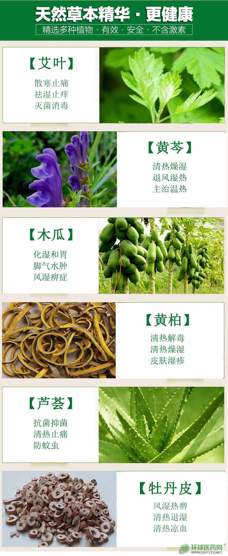 | 主要成分 | 艾葉、木瓜、黃柏、蘆薈、黃芩、牡丹皮 |