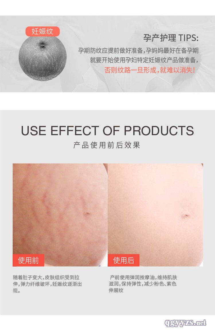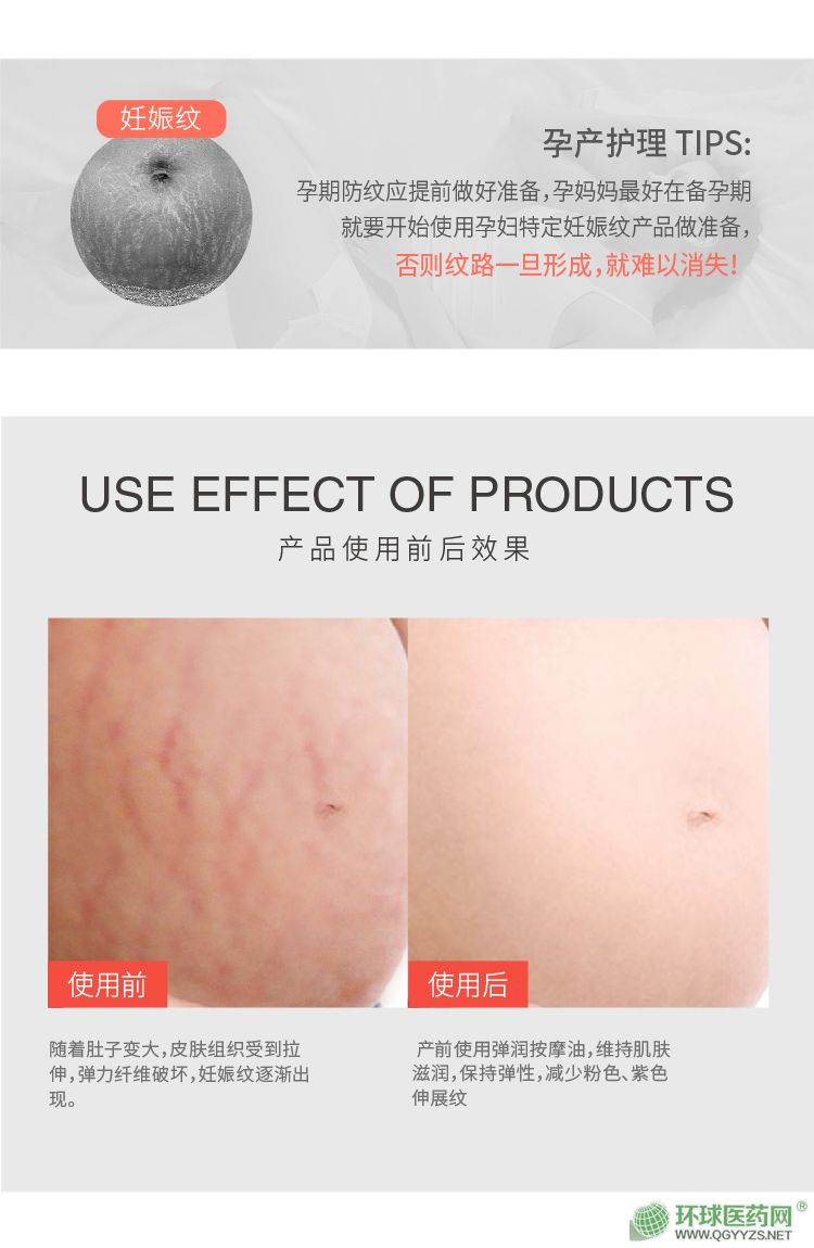 | 使用方法 | 潔膚后,取適量涂抹于腹部、大腿、臀部等易產(chǎn)生妊娠紋或干燥的部位,稍加按揉至吸收即可。 |
