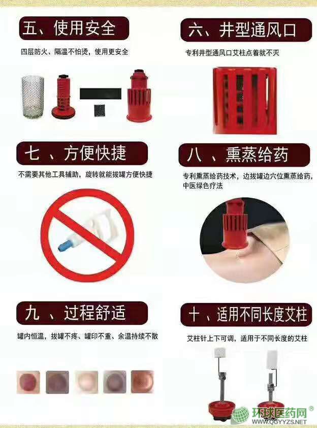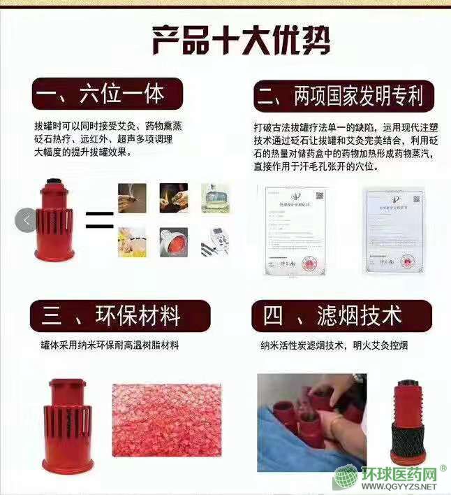| 產品用途 | 熏蒸給藥多功能拔罐器”“是我公司優(yōu)質研發(fā)生產,榮獲國家兩項專利,融合多種中醫(yī)外治療法。打破了傳承數(shù)百年的古法拔罐療法單一的罐法理論。本品拔罐同時實施艾灸、砭石熱療、穴位熏蒸給藥、四種中醫(yī)外治療法,彌補了單一拔罐只泄不補的不足。 作用機理1、艾條燃燒產生的熱力,激發(fā)了砭石“微晶、超聲、遠紅外功能”。艾條給砭石加熱后,砭石產生熱量加上砭石自身的紅外、超聲波帶動儲藥盒中溫熱的藥物蒸汽離子,通過人體穴位進入人體經絡活化人體細胞機能。 2、砭石的熱力和熏蒸藥物離子的共同作用,使所拔病痛部位毛細血管擴張數(shù)倍,溫熱蒸汽藥物離子即沿人體經絡血脈直接滲透到病灶,藥效發(fā)揮充分,溫經通絡,行氣活血,祛濕逐寒,平衡陰陽的目的,從而達到病除根治的調治效果。 全國優(yōu)質、兩項發(fā)明專利、艾灸熏蒸無煙拔罐器!雙12預售,19年**1000套。強大的售后團隊支持,遠程教學、邀約面授、中醫(yī)課堂,包教包會、馬云都看好的健康行業(yè)、源頭廠家歷經多年研發(fā)橫空出世的專利產品,期待您的加盟 |