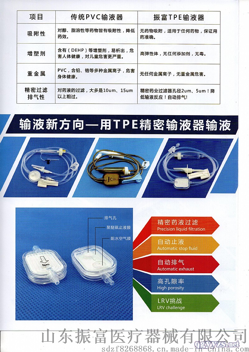 | 產(chǎn)品用途 | TPE材質(zhì),不含(DEHP)增塑劑,適宜于各類(lèi)人群并用于臨床**輸液。產(chǎn)品精密過(guò)濾孔經(jīng)2微米、5微米,分別適用于輸注各類(lèi)不同藥物。對(duì)藥物無(wú)吸附性,**患者用藥的準(zhǔn)確性和治療效果。焚燒不會(huì)產(chǎn)生嚴(yán)重污染環(huán)境的二惡英。 |