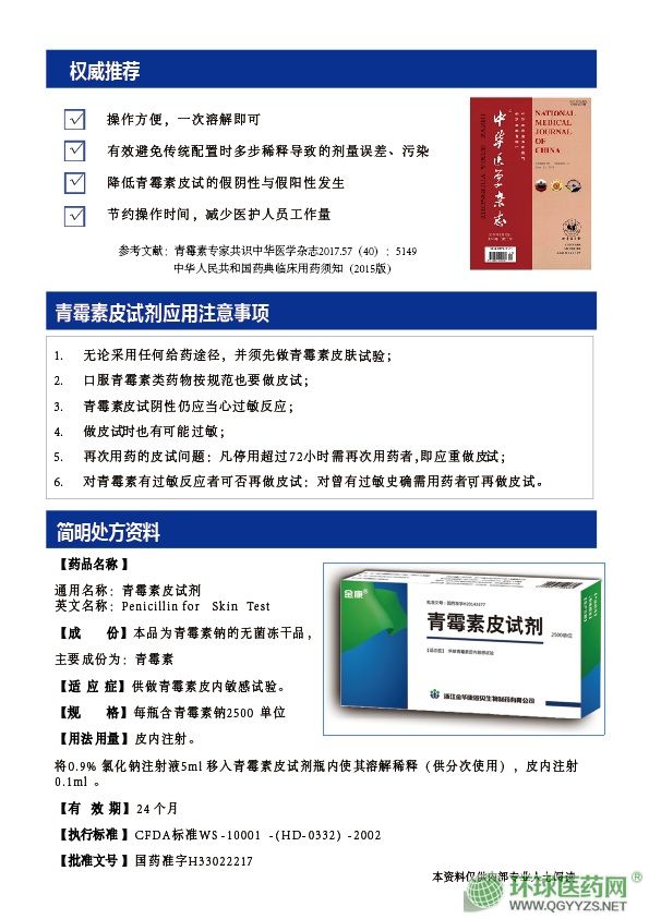| 產(chǎn)品賣點(diǎn) | CFDA批準(zhǔn)**用于青霉素類藥物皮試專用品; 全國優(yōu)質(zhì),醫(yī)保乙類; 標(biāo)準(zhǔn)規(guī)范,快捷準(zhǔn)確; |