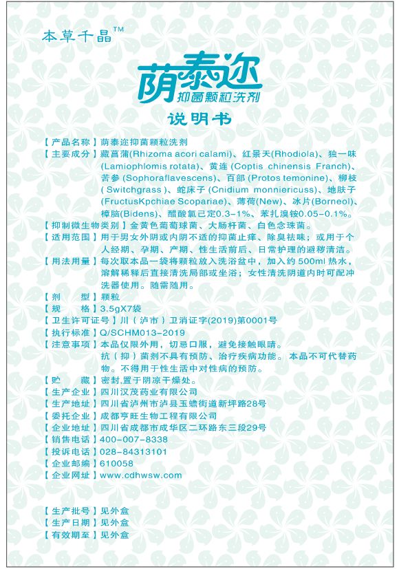| 產(chǎn)品名稱 | 蔭泰邇婦科男科抑菌顆粒洗劑 |