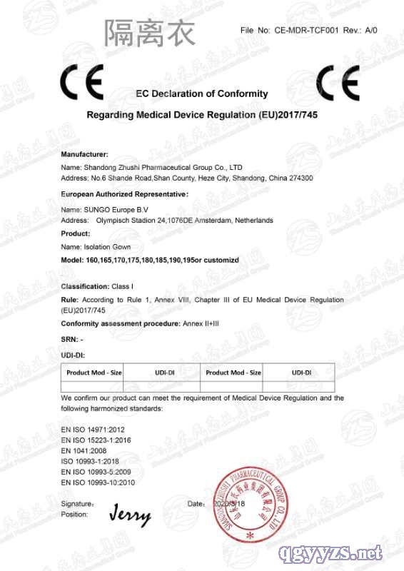 | 補(bǔ)充說明 | 用途:用于醫(yī)療機(jī)構(gòu)門診,病房,檢查室等作普通隔離。通常采用非織造布為主要原料,經(jīng)裁剪裁縫制成,非無(wú)菌提供,一次性使用 |
