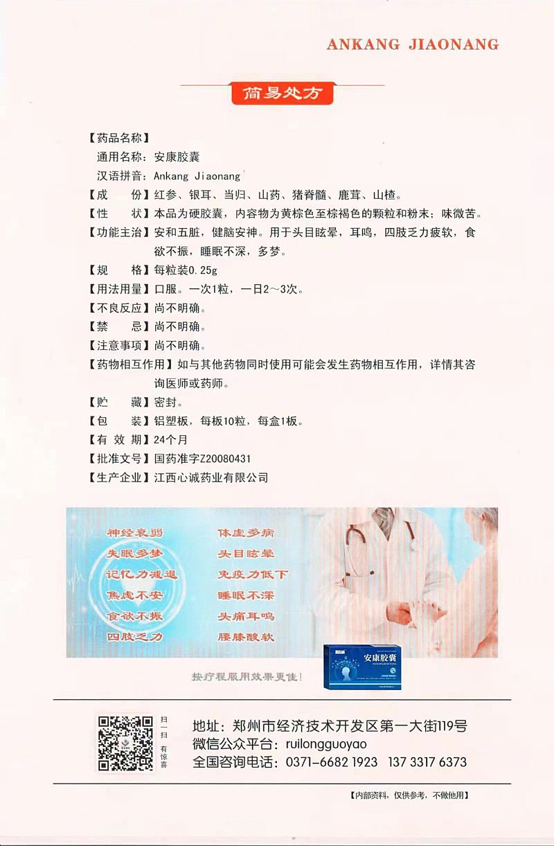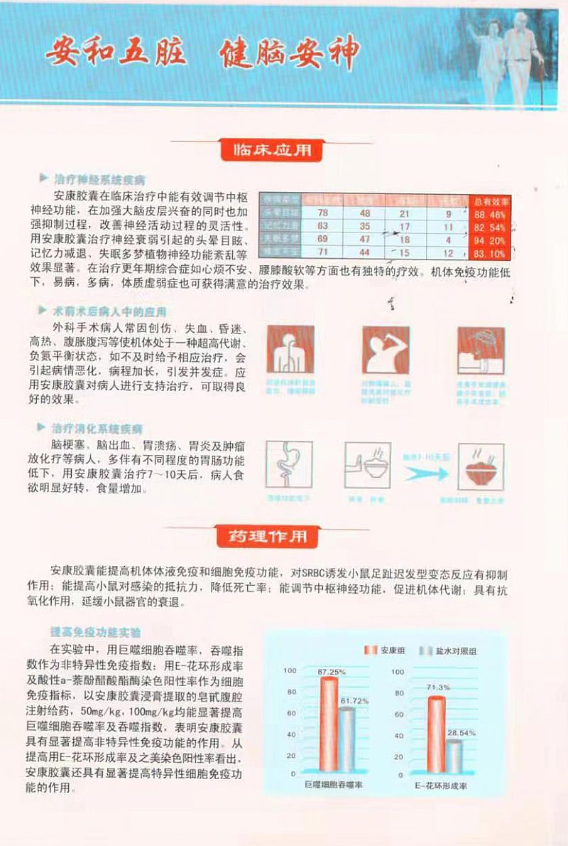 | 作用機理 | 紅參、銀耳、當(dāng)歸、山藥、動物骨髓提取物、鹿茸山楂等。安康膠囊組方科學(xué),選材道地。 紅參:精選東北道地紅參。具有大補元氣,復(fù)脈固脫,益氣生津、寧神益智、補腎益精、調(diào)補五臟、強心固脫,增加人體的特異性免疫功能。 銀耳:強精、補腎、潤肺生津,止渴清熱,補氣和血補腦強心。 當(dāng)歸:補學(xué)活血、調(diào)經(jīng)止痛,潤腸通便。 山藥:補脾養(yǎng)胃,生津益肺、補氣澀精。 鹿茸:壯腎陽,益精血,強筋骨,調(diào)沖任。 山楂:開胃消食、活血散瘀、化痰行氣、能增加冠脈血流量、改善心臟活力、降低血壓和膽固醇、軟化血管。 |
