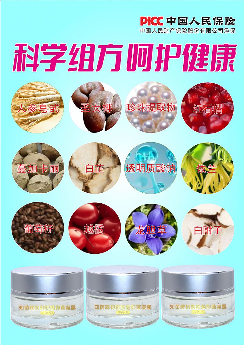 | 主要成分 | 凝膠:生物肽、蜂膠提取物、益母草提取物,白芷提取物、紅花提取物、冰片、當(dāng)歸提取物、苦參提取物、蛇床子提取物、薄荷腦、乳香提取物、維生素E0.1%。 凝露:依蘭提取物(Canangaodorata)、人參皂苷(Ginsenoside)、珍珠提取物、圣女椰提取物(Lodoiceamaldivica)、紅石榴提取物(PunicagranatumLinn.)、蔓加卡麗提取物(Manjakani)、透明質(zhì)酸鈉、葡萄籽提取物(VitisviniferaLinn)、越橘提取物(VaccininmulingosumL.)、龍膽草提取物(GentianascabraBunge)、紫草提取物(LithospermumerythrorhizonSieb.etZucc.)、白附子提取物(Typhoniumgiganteum Engl.)、白芷提取物、茯苓提取物。 |