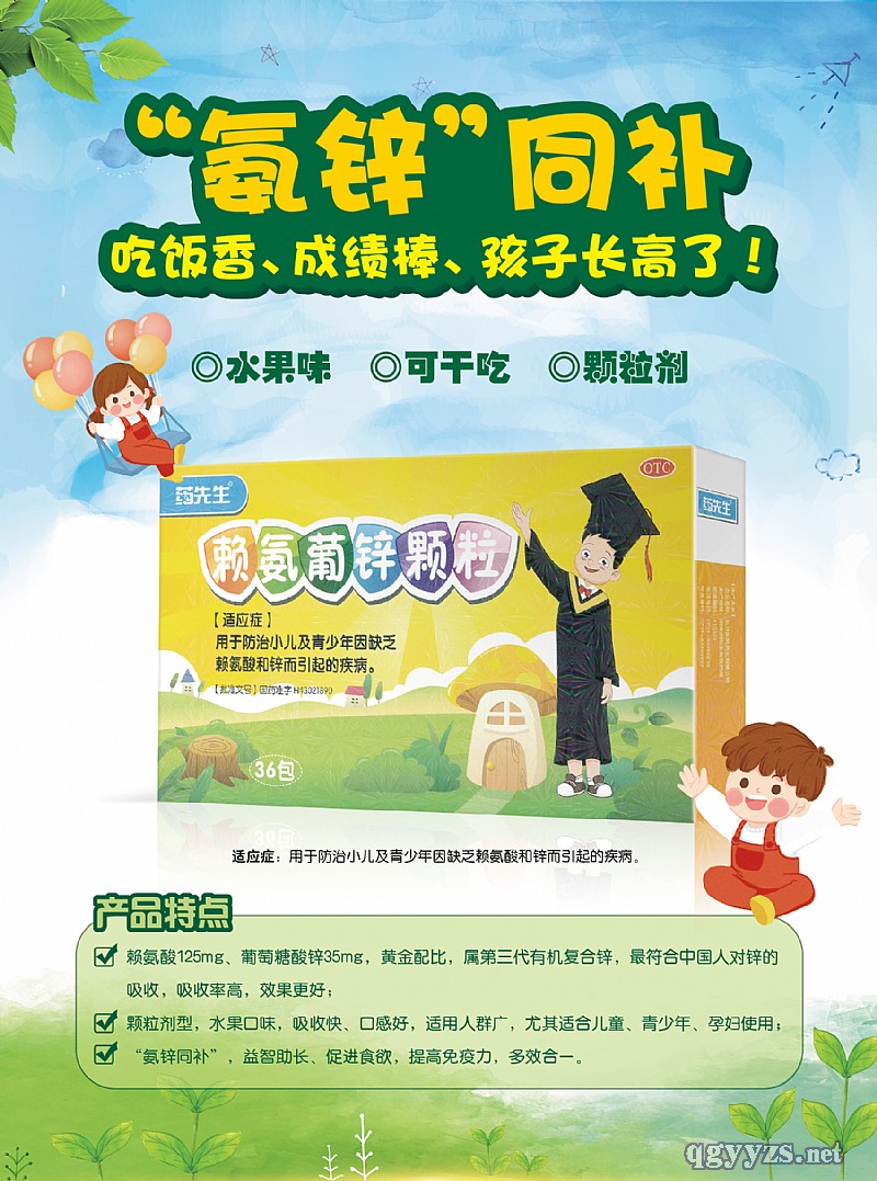 | 產(chǎn)品賣點(diǎn) | ①“氨”“鋅”同補(bǔ),水果味,可干吃,顆粒劑 ②賴氨酸125mg、葡萄糖酸鋅35mg,黃金配比,屬第三代有機(jī)復(fù)合鋅,*符合中國(guó)人對(duì)鋅的吸收,吸收率高,效果更好; ③顆粒劑型,水果口味,吸收快、口感好,適用人群廣,尤其適合兒童、青少年、孕婦使用; ④“氨鋅同補(bǔ)”,益智助長(zhǎng)、促進(jìn)食欲,提高免疫力,多效合一。 |
