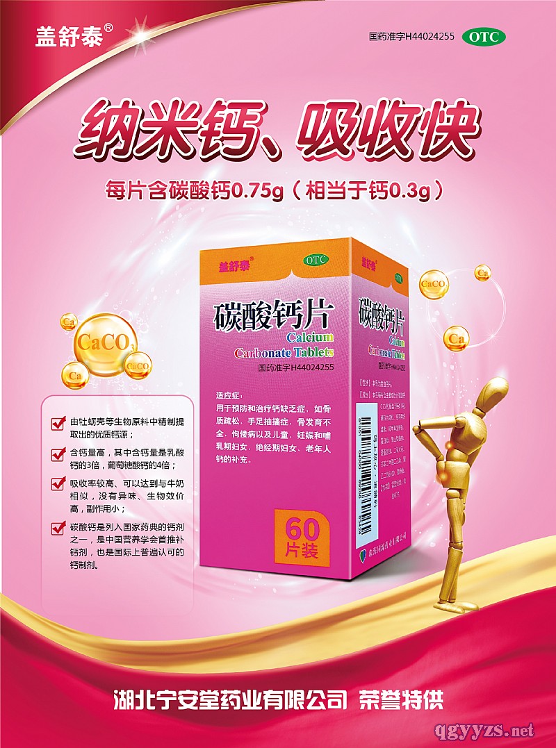 | 產(chǎn)品賣(mài)點(diǎn) | ●每片含碳酸鈣0.75g(相當(dāng)于鈣0.3g); ●由牡蠣殼等生物原料中精制提取出的優(yōu)質(zhì)鈣源; ●含鈣量高,其中含鈣量是乳酸鈣的3倍,葡萄糖酸鈣的4倍; ●吸收率較高、可以達(dá)到與牛奶相似,沒(méi)有異味、生物效價(jià)高 |