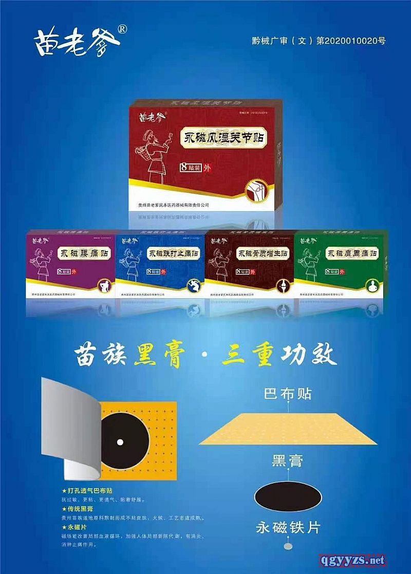 | 其它說(shuō)明 | 適用于風(fēng)濕骨性關(guān)節(jié)炎、肩周、跌打、腰痛等所引起的疼痛病癥,傳統(tǒng)苗族特色黑膏藥,16年品牌沉淀,質(zhì)量****! |