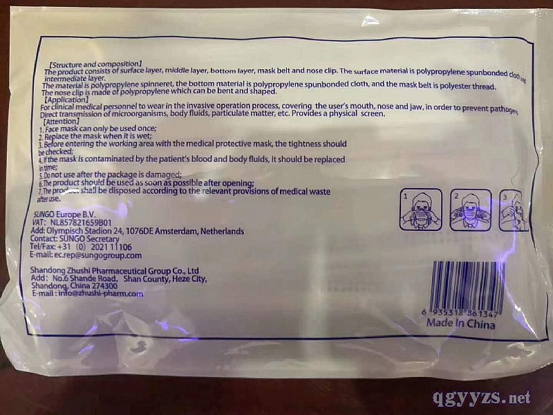 | 主要成分 | 一次性使用醫(yī)用外科口罩由表層、中間層、底層、口罩帶、鼻夾等構成。表層材料為醫(yī)用級聚丙烯防粘布,中間層材料為聚丙烯噴絲法制成的高效過濾熔噴布,底層材料為醫(yī)用級聚丙烯防粘布,口罩帶為滌綸線和少量氨綸線針織而成,鼻夾為可彎折、可定型的聚丙烯制成。 |