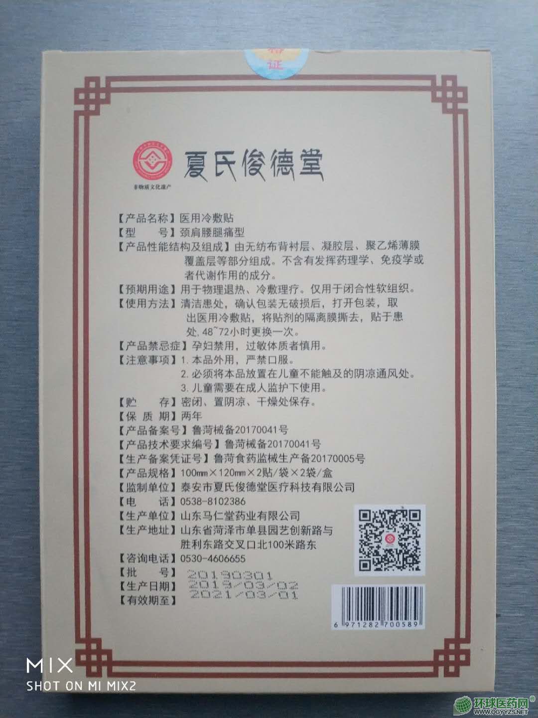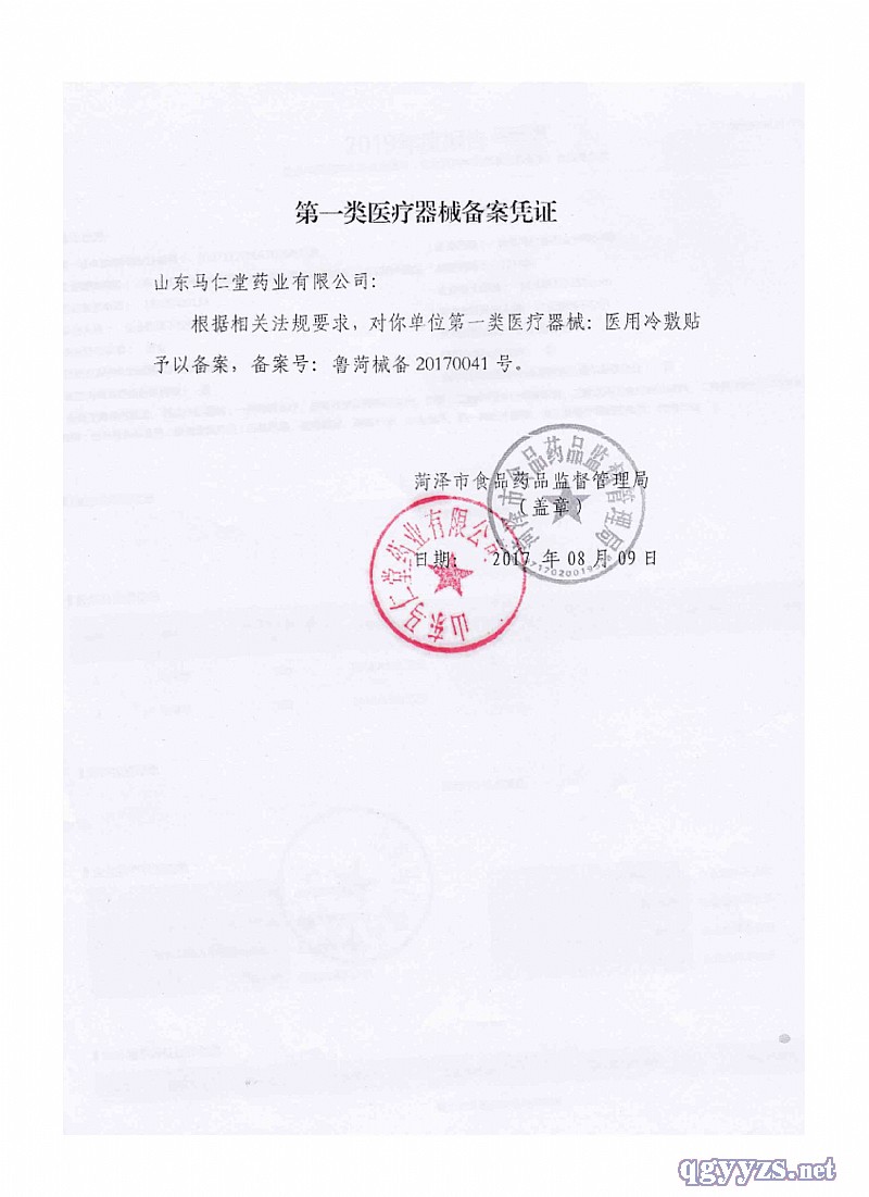| 補(bǔ)充說明 | 【產(chǎn)品禁忌癥】孕婦禁用,過敏體質(zhì)者慎用。 【注意事項】1.本品外用,嚴(yán)禁口服。 2.必須將本品放置在兒童不能觸及的陰涼通風(fēng)處。 3.兒童需要在成人監(jiān)護(hù)下使用。 【貯 存】密閉、置陰涼、干燥處保存。 【保質(zhì)期】兩年 【產(chǎn)品備案號】魯菏械備20170041號 【產(chǎn)品技術(shù)要求編號】魯菏械備20170041號 【生產(chǎn)備案憑證號】魯菏食藥監(jiān)械生產(chǎn)備20170005號 【產(chǎn)品規(guī)格】100mmX120mmX2貼/袋X2袋/盒 【監(jiān)制單位】泰安市夏氏俊德堂醫(yī)療科技有限公司 【電 話】0538-8102386 【生產(chǎn)單位】山東馬仁堂藥業(yè)有限公司 【生產(chǎn)地址】山東省荷澤市單縣園藝創(chuàng)新路與 勝利東路交叉口北100米路東 【咨詢電話】0530-4606655 【批 號】見外盒 【生產(chǎn)日期】見外盒 【有效期至】見外盒 請仔細(xì)閱讀說明書并按說明使用或在醫(yī)師指導(dǎo)下購買和使用 |