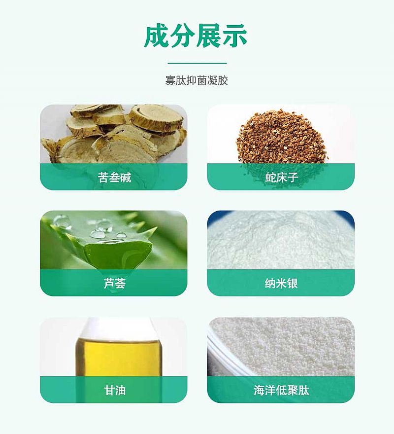 | 主要成分 | 苦參、堿、蘆薈、枯礬、海洋低聚肽、羥甲基殼寡糖、納米銀(20-100ug/g)、卡波姆、甘油、三乙醇胺、尼泊金乙酯、純化水。 |