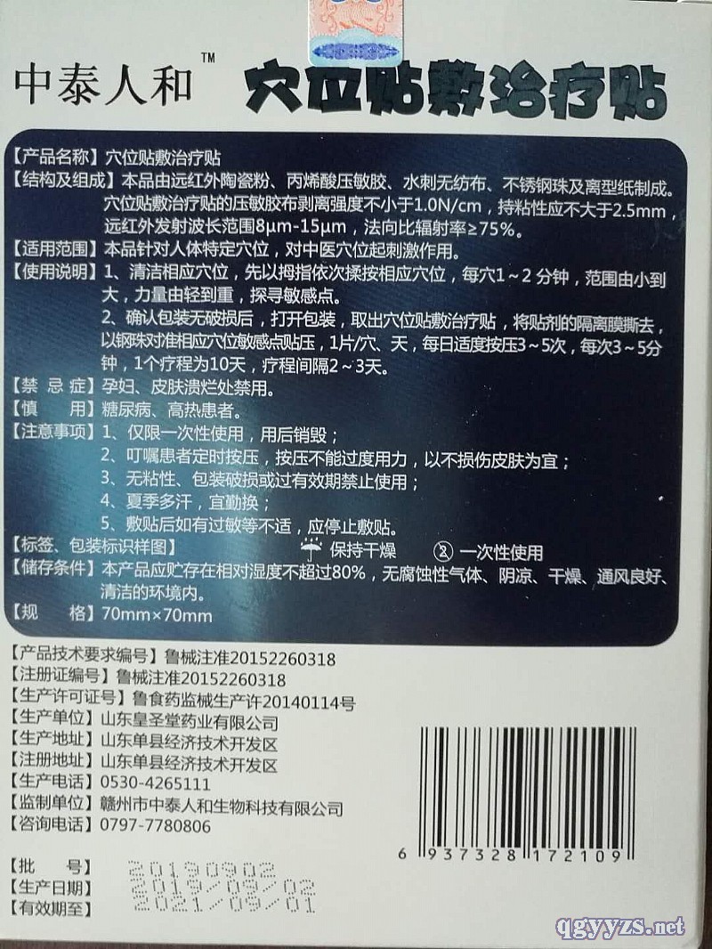 | 補充說明 | 1.僅限一次性使用,用后銷毀; 2.叮囑患者定時按壓,按壓不能過度用力,以不損傷皮膚為宜; 3.無粘性,包裝破損或過有效期禁止使用; 4.夏季多汗,宜勤換; 5.貼敷后如有過敏等不適,應(yīng)停止貼敷。 6.孕婦,皮膚潰爛處禁用。 7.糖尿病,高熱患者慎用。 |