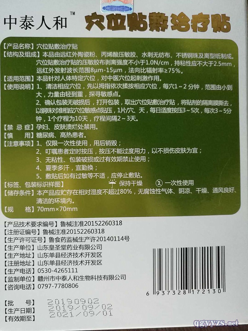 | 補充說明 | 1.僅限一次性使用,用后銷毀; 2.叮囑患者定時按壓,按壓不能過度用力,以不損傷皮膚為宜; 3.無粘性,包裝破損或過有效期禁止使用; 4.夏季多汗,宜勤換; 5.貼敷后如有過敏等不適,應停止貼敷。 6.孕婦,皮膚潰爛處禁用。 7.糖尿病,高熱患者慎用。 |