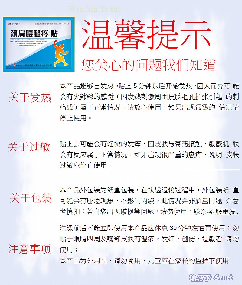 | 補充說明 | 注意事項:1.本品外用,禁止內(nèi)服。皮膚過敏者,應停止使用本品。 2.兒童必須在成人監(jiān)護下使用,請將本品放在兒童不能接觸的地方。 3.揭貼時防止疼痛,將膠布反折與皮膚平行。 4.本品為保健用品不能替代藥品和醫(yī)療器械 |