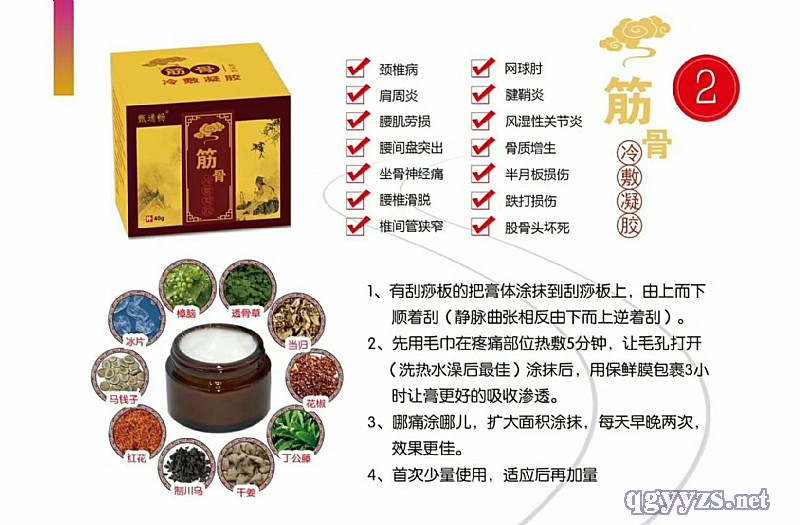 | 使用方法 | 疼痛膏涂抹到皮膚,2分鐘時(shí)間就開始自動(dòng)發(fā)熱,讓藥力直達(dá)病灶部位,藥力借助熱力強(qiáng)行把風(fēng)寒濕邪氣從體內(nèi)排出體外,讓疾病痛苦可以很快的緩解,并**,針對(duì)風(fēng)濕骨病、頸椎病,肩周炎,月子病、宮寒,痛經(jīng),手腳冰涼,婦科病有著非常**的效果。使用簡單,不用**定穴位,讓理療更加的隨心所欲,規(guī)避了其他理療不足,一舉成為了當(dāng)下流行的涂抹膏藥形式。 |