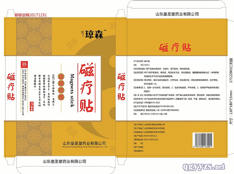 | 補(bǔ)充說明 | 【主要結(jié)構(gòu)】該產(chǎn)品由永磁粉劑、永磁片、透氣膠布、防粘紙制成 【適應(yīng)范圍】適用于FLS-A頸椎病、FLS-B肩周炎、FLS-C風(fēng)濕性關(guān)節(jié)炎、FLS-D急性扭傷、FLS-F骨質(zhì)增生的輔助。 【禁忌癥】體內(nèi)有植入電子產(chǎn)品和金屬產(chǎn)品禁用,有嚴(yán)重心臟病患者禁用;孕婦禁用;皮膚過敏者慎用 【貯存】密封、置陰涼干燥處保存 【執(zhí)行標(biāo)準(zhǔn)】YZB/魯0174-2012 【生產(chǎn)許可】魯食藥監(jiān)械生產(chǎn)許20140114號(hào) 【生產(chǎn)】山東皇圣堂藥業(yè)有限公司 |