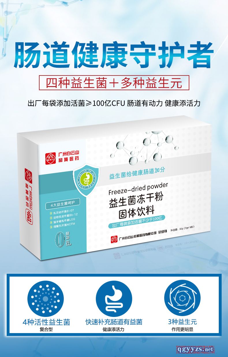 | 主要成分 | 水溶性膳食纖維(抗性糊精)、復(fù)合益生元(低聚果糖FOS+低聚半乳糖GOS)、DHA藻油粉、乳雙岐桿菌BL-G101、發(fā)酵乳桿菌LF-G89、副干酪乳桿菌LPc-G110、乳酸乳球菌乳酸亞種LLL-G25、長雙歧桿菌BL-G301、格式乳桿菌LG-G12、兩岐雙歧桿菌BB-G90、保加利亞乳桿菌LB-G40、植物乳桿菌Lp-G18;(出廠時(shí)活菌添加量每袋不少于200億CFU) |