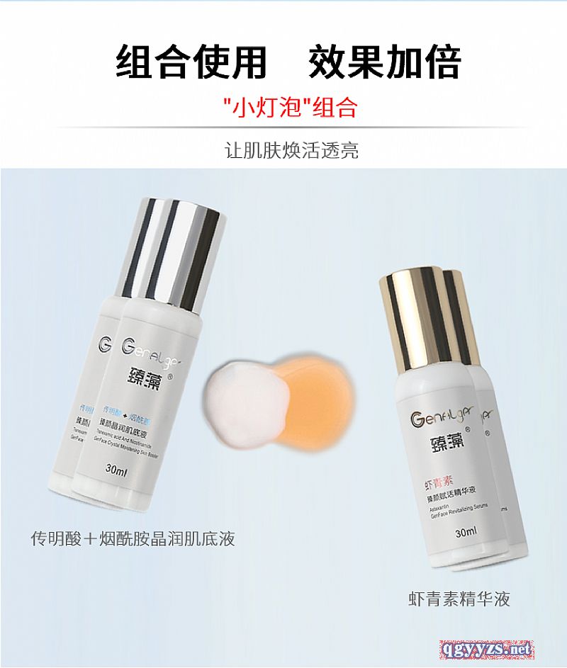 | 產(chǎn)品用途 | 1、改善暗沉——改善暗沉無光,煥亮粉嫩少女。2、淡化痘印——有效淡化痘印,肌膚通透亮澤;3、勻亮膚色——均勻膚色,顯效提亮焦糖臉; |