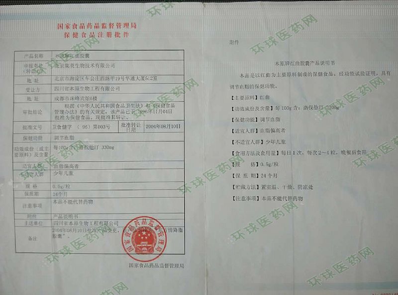 | 補(bǔ)充說(shuō)明 | 本原牌紅曲膠囊 本品是以紅曲為主要原料制成的保健食品,經(jīng)功能試驗(yàn)證明,具有調(diào)節(jié)血脂的保健功能。 主要原料:紅曲 批準(zhǔn)文號(hào):衛(wèi)食健字(96)第003號(hào) 主要成分及含量:每100g含洛伐他汀330mg 保健功能:調(diào)節(jié)血脂 事宜人群:血脂偏高者 不適宜人群:少年兒童 食用方法及食用量:每日1次,每次2~4粒,晚餐后食用 規(guī)格:0.5克/粒 保質(zhì)期:24個(gè)月 貯藏方法:置陰涼通風(fēng)干燥處 本品不能替代藥物 |