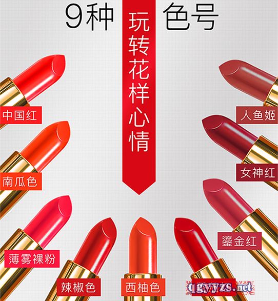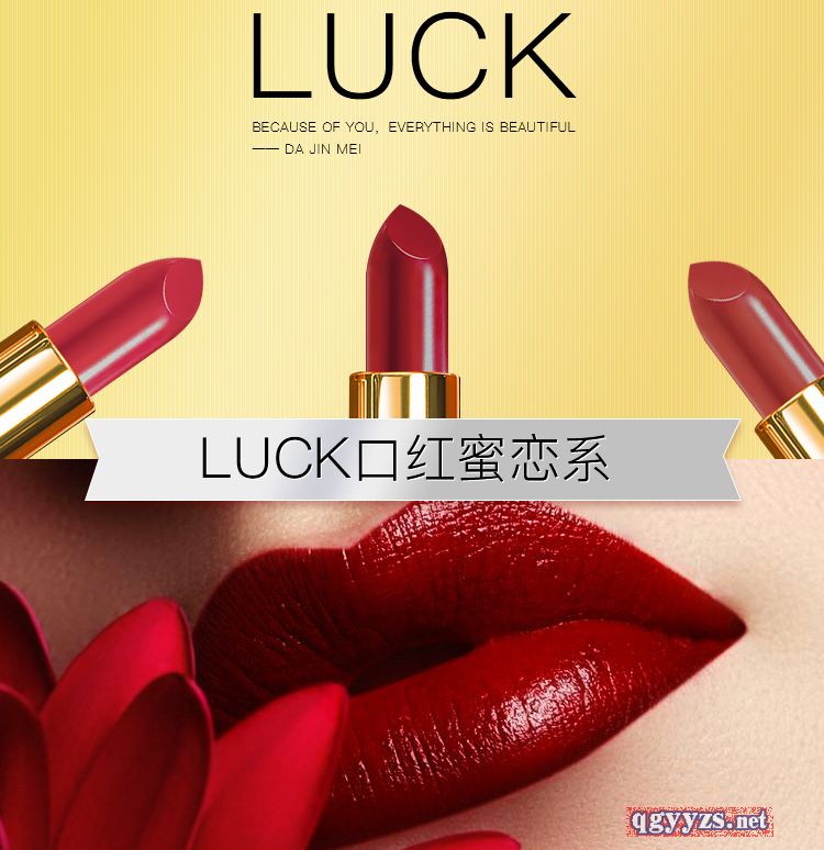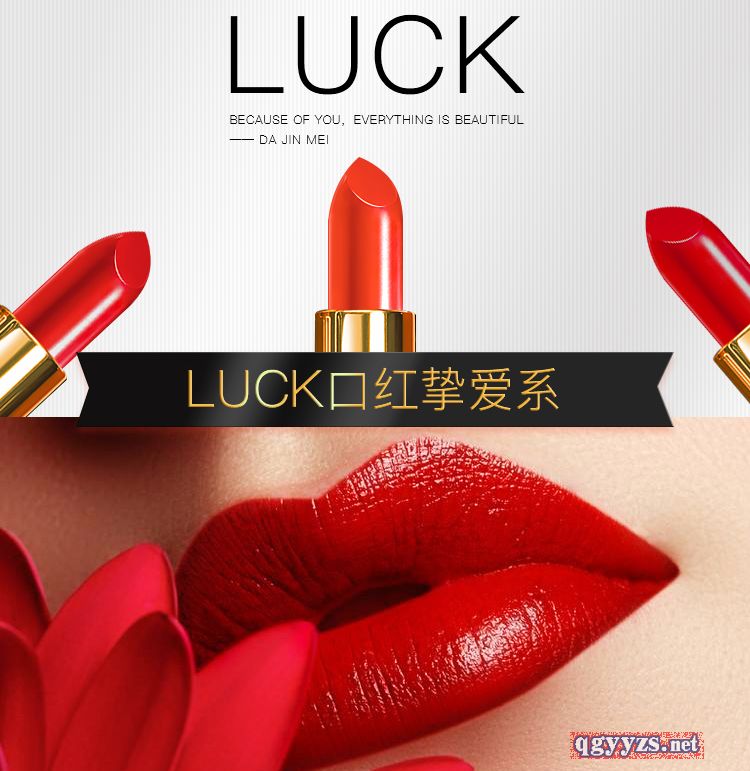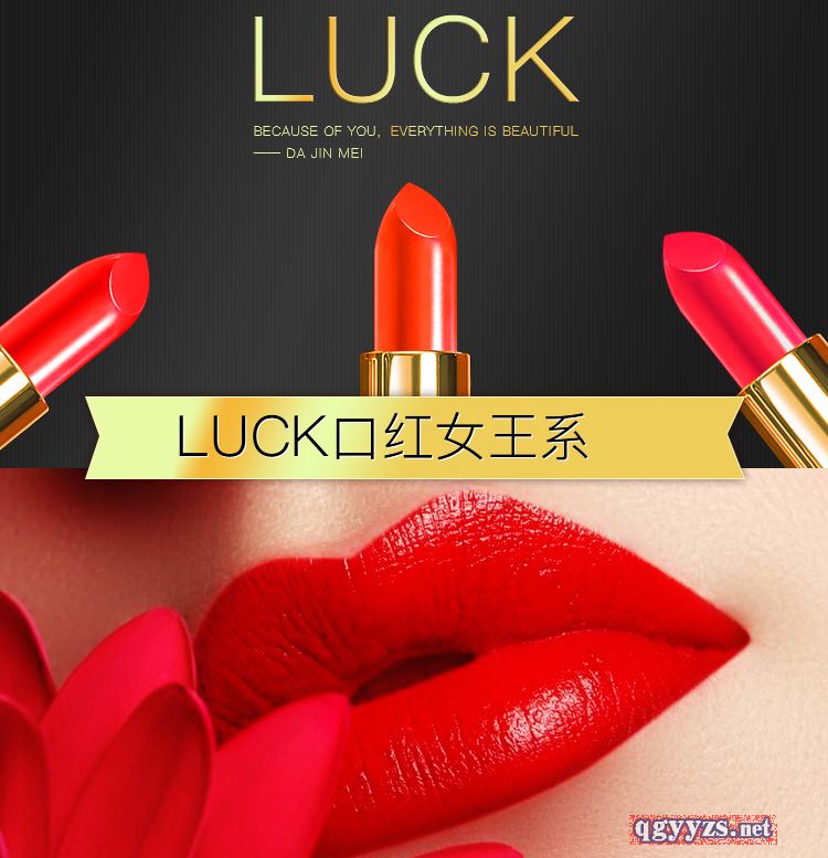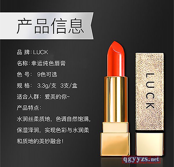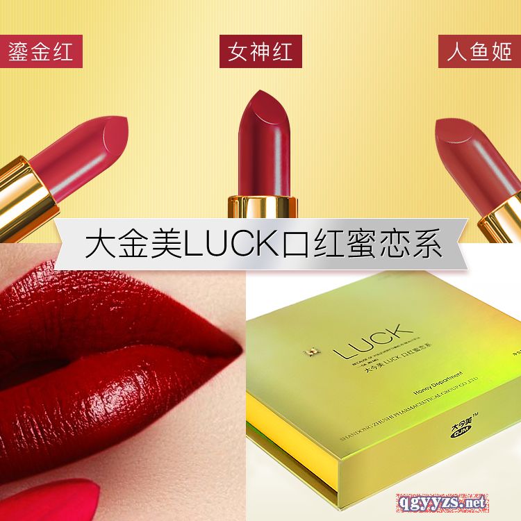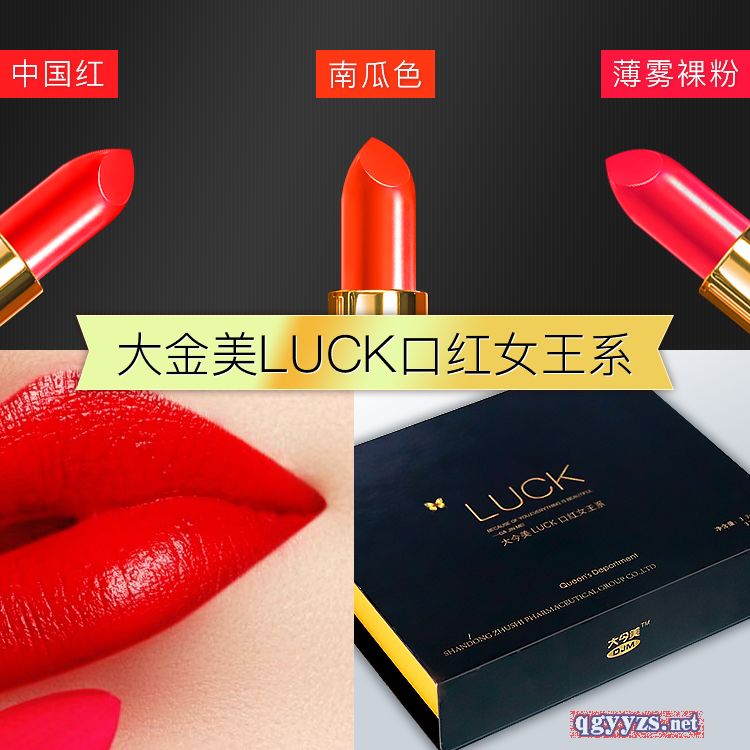 | 產(chǎn)品賣點 | 大今美LUCK口紅口紅分為三個系列: 白色套盒:辣椒紅、西柚色、番茄紅(摯愛系) 金色套盒:琉金紅、女神紅、人魚姬(蜜戀系) 黑色套盒:中國紅、南瓜色、薄霧裸粉(女王系) |