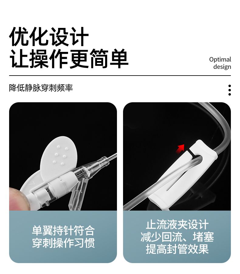 | 補(bǔ)充說明 | 1)整體密閉式設(shè)計(jì),防止血液溢出,避免血源性疾病的感染。 2)雙斜面針尖設(shè)計(jì)減輕疼痛,減少出血,提高穿刺成功率。 3)單翼持針符合穿刺操作習(xí)慣,提高穿刺成功率。 4)小夾子設(shè)計(jì),減少血液回流,減少堵管,提高封管效果,更換輸液接頭(輸液),防止血液溢出。 |