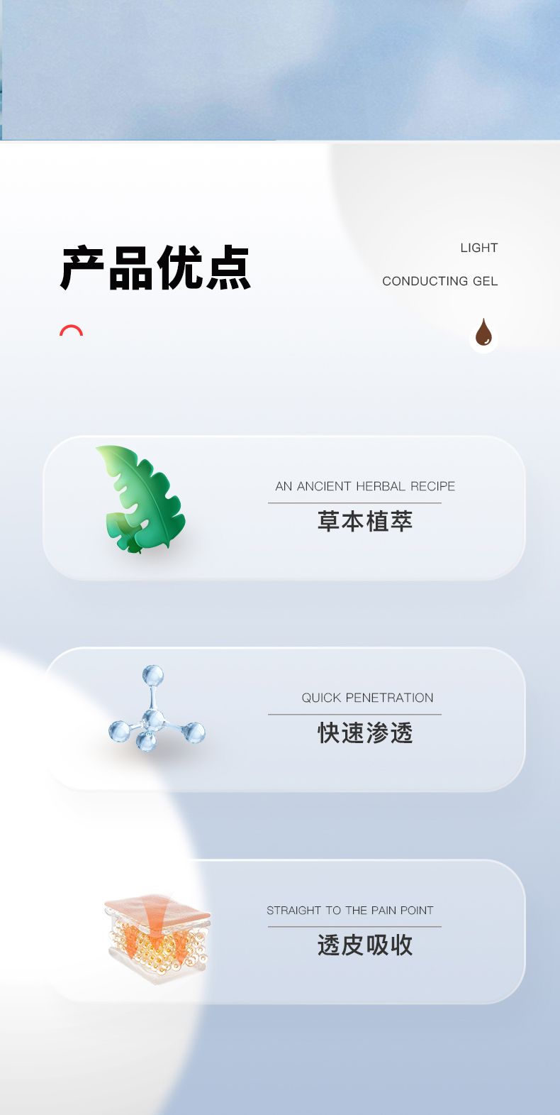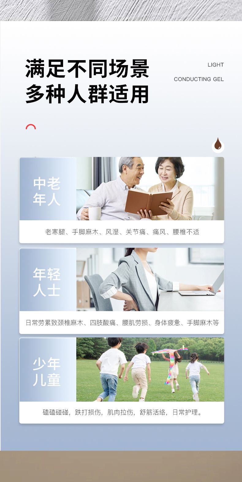 | 產(chǎn)品用途 | 用于肩周炎、關(guān)節(jié)炎(非急性期)、頸椎病、腰椎間盤(pán)突出、腰肌勞損、骨質(zhì)增生、腱鞘炎、扭挫傷(非急性期)引起不適癥狀的輔助治療。用于光子治療過(guò)程中隔熱和導(dǎo)光,與光子治療設(shè)備配合使用。 |
