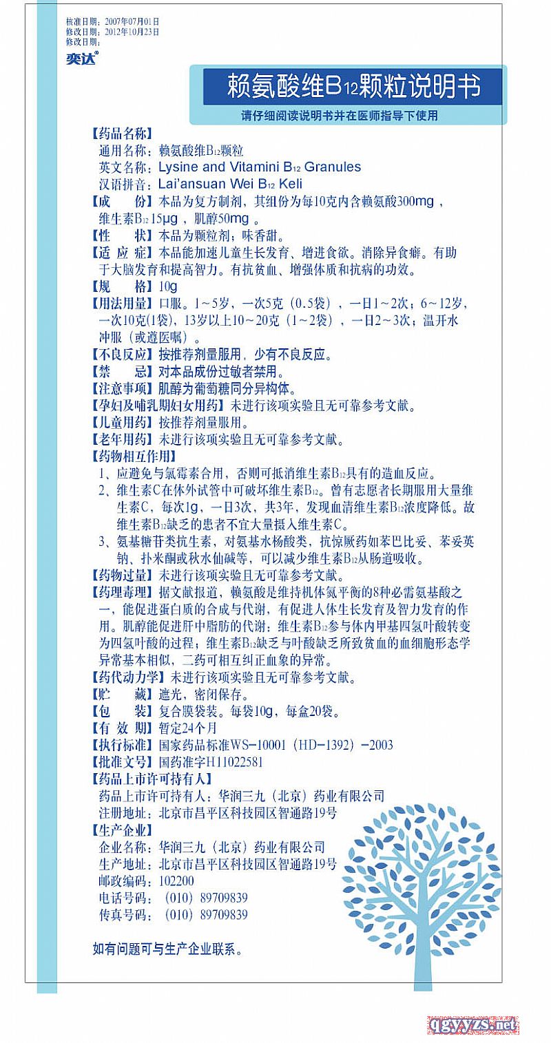 通用名稱: 賴氨酸維B12顆粒