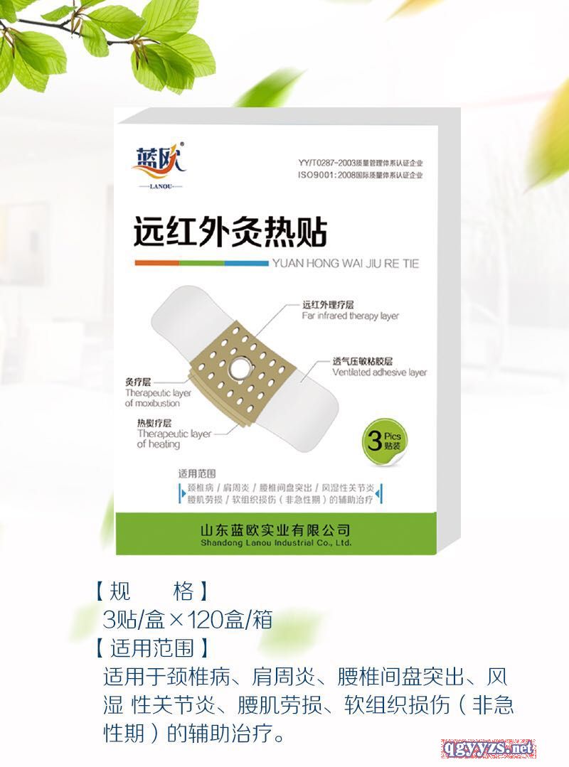 | 產(chǎn)品賣點(diǎn) | 紅外灸熱帖以中藥、礦物質(zhì)電氣石和遠(yuǎn)紅外陶瓷粉為核心,與納米生物功能材料形成一體組成本產(chǎn)品。 1、產(chǎn)品,作用持久,能量直達(dá)人體深層部位。 2、療效好,快,熱療和藥物相結(jié)合,見效快。 3、**性及先進(jìn)性:臨床依據(jù)中醫(yī)雷火灸法或隔物灸法原理直接貼敷患處,充分體現(xiàn)溫?zé)嵝?yīng)和紅外磁療的協(xié)調(diào)作用。 4、方便實(shí)用,產(chǎn)品為袋裝膏貼,遇空氣自行發(fā)熱,開袋后5**產(chǎn)品開始發(fā)熱,溫度范圍40℃-60℃之間,持續(xù)時間≥7h。 5、國家二類醫(yī)療器械準(zhǔn)字號,醫(yī)保收費(fèi)項(xiàng)目:雷火灸法、隔物灸法、灸法等. 6、局部的微循環(huán)系統(tǒng)恢復(fù)正常生理功能。 |