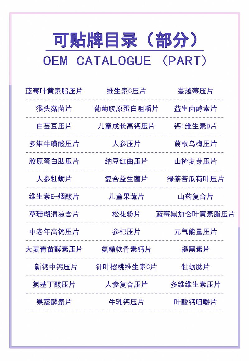 | 產(chǎn)品名稱 | 食品片劑oem固體飲料酵素壓片糖果膠囊粉劑來樣貼牌 |